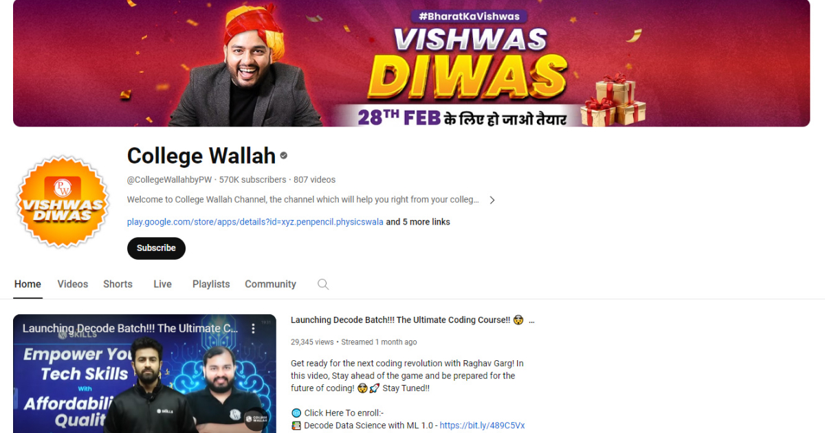 The College Wallah YouTube channel was launched by Physics Wallah. This channel has more than 560K subscribers. All the tutorial videos related to web development are well-structured & beginner-friendly.