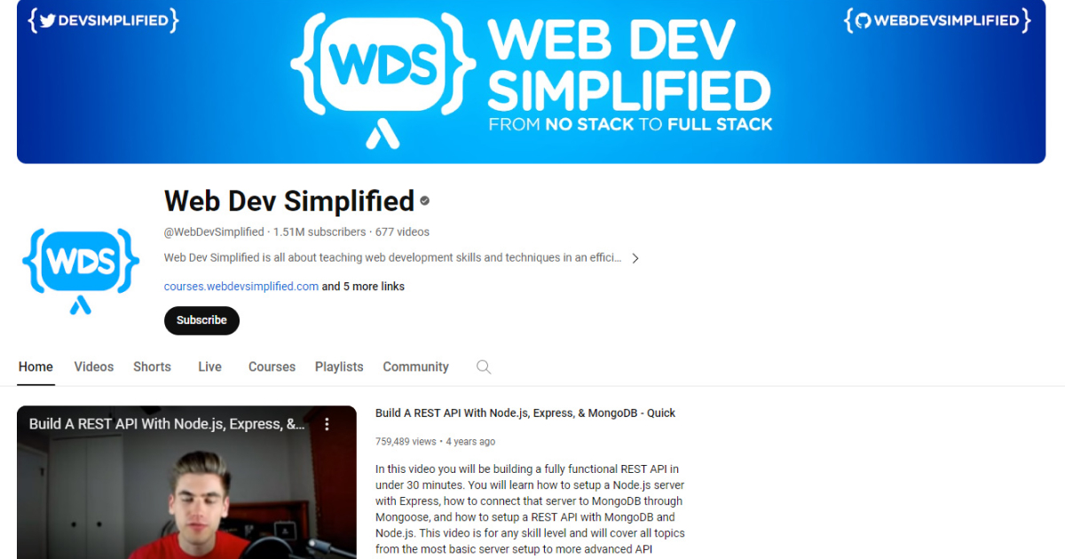 Web Dev Simplified YouTube channel, which was created by Kyle Cook. It has over 1.50 million subscribers. You can find dedicated playlists of tutorial videos here that will help you learn front-end and back-end web development.